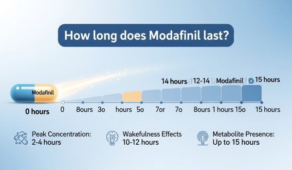 A: Modafinil’s effects taper off in 10–15 hours. But if you dose too late or take too much, you might have trouble sleeping. Adjust timing gradually.